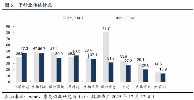 截至2025年12月12日,医药指数市盈率为37.11倍,环比上周下降0.37倍,低于历史均值1.34倍;沪深300指数市盈率为13.91倍,医药指数盈利率溢价率为166.8%,环比上周下降0.5%,低于历史均值13.6%。