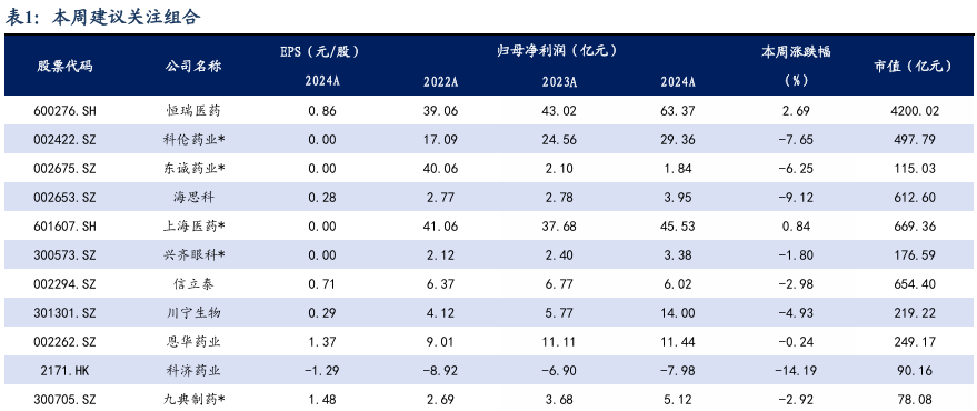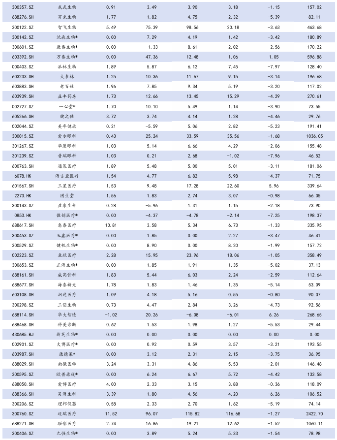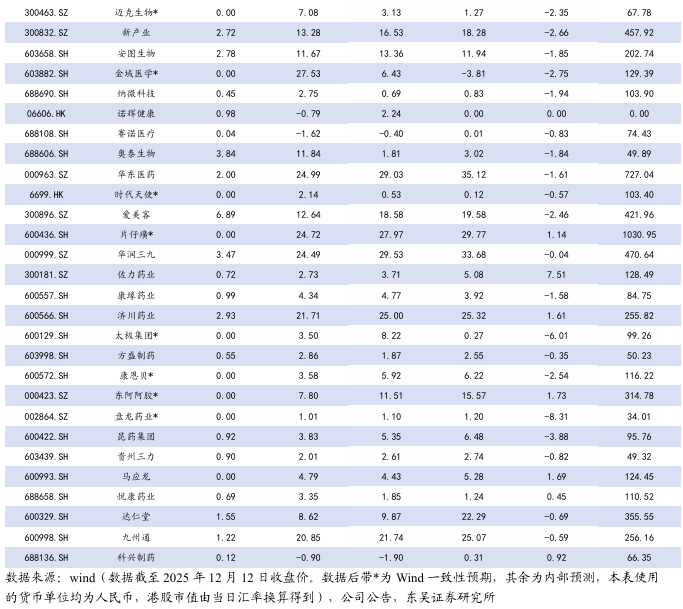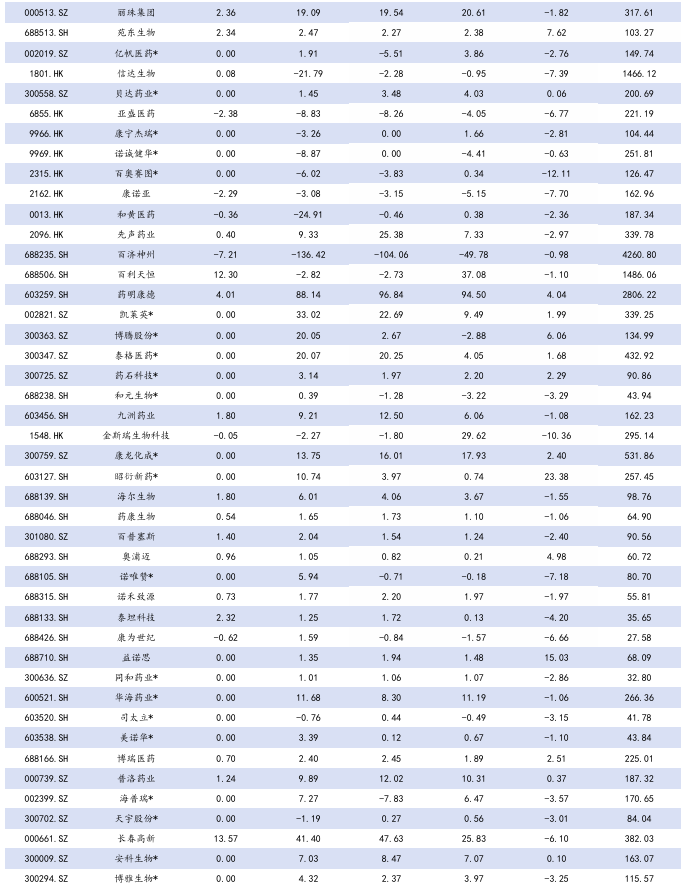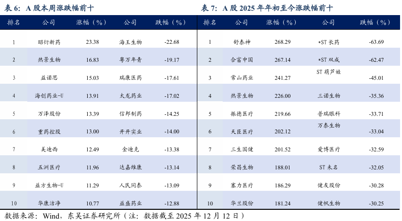 本周A股涨幅居前为昭衍新药( 23.38%)、热景生物( 16.83%)、益诺思( 15.03%),跌幅居前为海王生物(-22.68%)、粤万年青(-19.17%)、瑞康医药(-17.61%)。本周H股涨幅居前圣诺医药( 30.88%)、昭衍新药( 30.55%)、轩竹生物( 28.11%),跌幅居前中国再生生物(-19.44%)、现代中药集团(-16.67%)、药捷安康(-16.30%)。