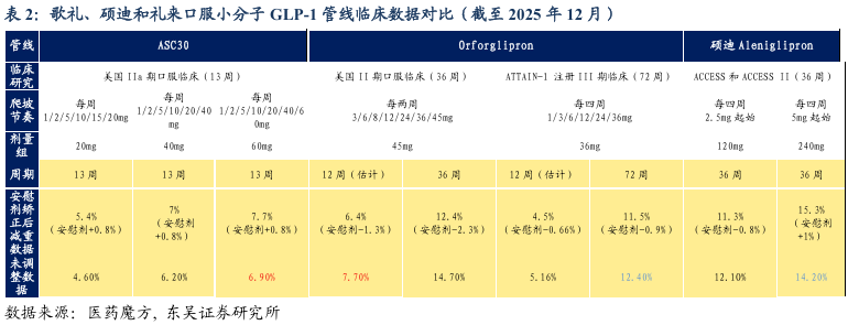 我们对比了目前在口服小分子赛道中三位主要玩家的核心管线临床数据。目前礼来的Orforglipron是进展最快的,已经完成了III期临床研究,进入NDA阶段了。其72周减重11.5%的数据曾被市场认为低于预期。我们根据礼来披露的学术文章中的图表对其12周数据进行了估算,安慰剂矫正后ASC30的减重效果明显优于Orforglipron,展现出BIC潜力。硕迪的Aleniglipron在36周时的数据相比礼来同样具备一定优势,但由于其剂量较大,可能导致每日服用片剂量增加,因此在后续商业化阶段患者的服药依从性降低。