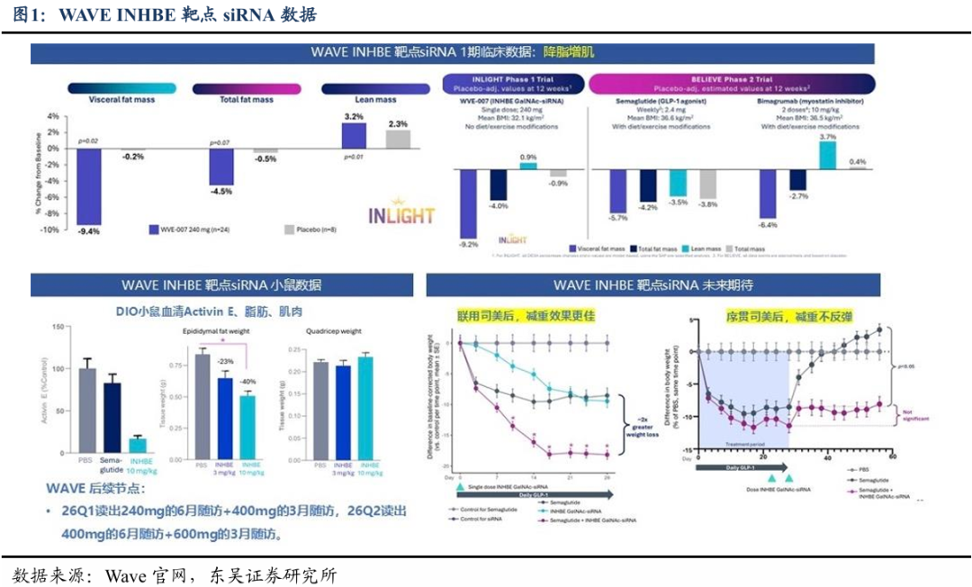 Wave life science:12月8日,该公司公布了WVE-007,一款靶向INHBE的GalNAc siRNA,针对肥胖症I期INLIGHT临床试验的中期数据。单次皮下注射240mg后,受试者在三个月时的体成分较基线水平显著改善:内脏脂肪减少9.4%(p=0.02),全身脂肪减少4.5%(对应减重3.5磅,p=0.07),瘦体重增加3.2%(对应增重4.0磅,p=0.01)。该靶点机制通路中血清激活素E水平持续且显著的抑制效果,为该药物实现每年1-2次的给药频率奠定了基础。且公司表示其安全性和耐受性良好,仅出现轻度治疗相关不良事件,血脂、肝功能等各项临床实验室检测指标均未出现具有临床意义的改变。