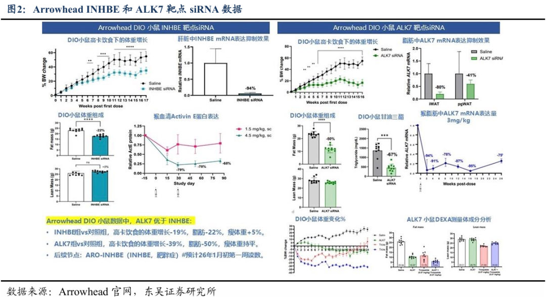 我们认为这提示了小核酸在减重领域具有巨大潜力,值得重点关注。关于后续相关催化,Wave将在2026Q1-Q2读出计量爬坡列队数据;Arrowhead将分别于2026年1月和Q3读出INHBE和ALK7的数据。国内众多药企也布局了小核酸药物减重领域,建议关注小核酸赛道研发进展,包括悦康药业、前沿生物、恒瑞医药、石药集团、热景生物、迈威生物、腾盛博药、圣诺医药、舶望制药、瑞博生物、福元医药、阳光诺和、成都先导、必贝特等。