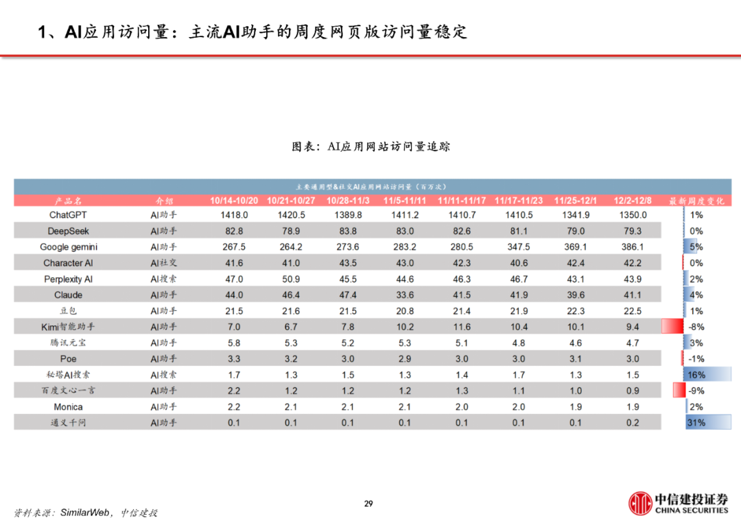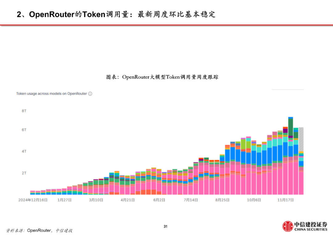 关注12月18日火山引擎FORCE原动力大会。据火山引擎公众号,会议内容包括豆包大模型家族全线焕新、Agent开发工具升级等,将设立AI应用、视频与边缘、智能硬件等7个产品论坛和AI 消费、AI 游戏等6个行业论坛,我们预计届时也将披露最新的豆包模型Token调用量,更新AI端侧布局、即梦等多模态模型更新。此前火山引擎披露,截至2025年9月底豆包大模型日均Tokens调用量已突破30万亿,相比今年5月底增长超80%。折算后目前月度Token调用量达900万亿,接近谷歌Gemini的规模。