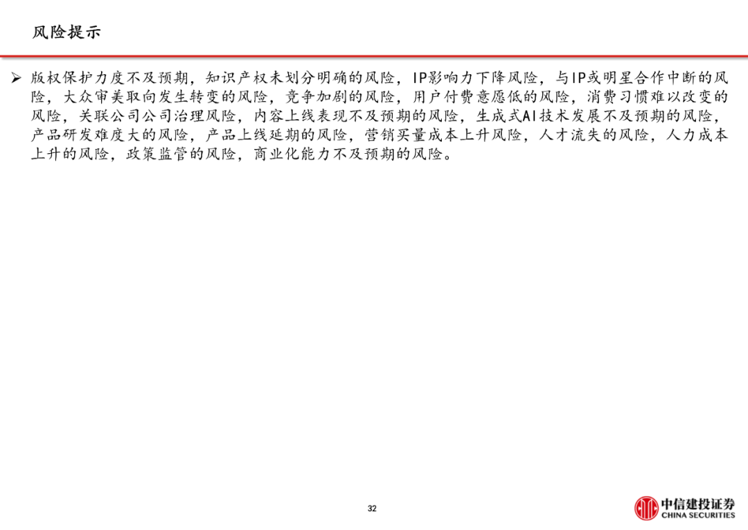 版权保护力度不及预期,知识产权未划分明确的风险,消费习惯难以改变的风险,关联公司治理风险,生成式AI技术发展不及预期的风险,产品研发难度大的风险,产品上线延期的风险,营销买量成本上升风险,人力成本上升的风险,政策监管的风险,商业化能力不及预期的风险,AI产品和服务的用户增长和付费率不及预期的风险,AI产品和服务降本提效效果不及预期的风险,新客户拓展不及预期的风险,生成式AI带来的数据安全风险,全球经济环境恶化风险,国内外互联网行业反垄断及监管风险,地缘政治导致客户出海困难的风险,竞争加剧风险,头部广告主预算缩减风险,品牌客户拓展不及预期的风险,人才流失风险。