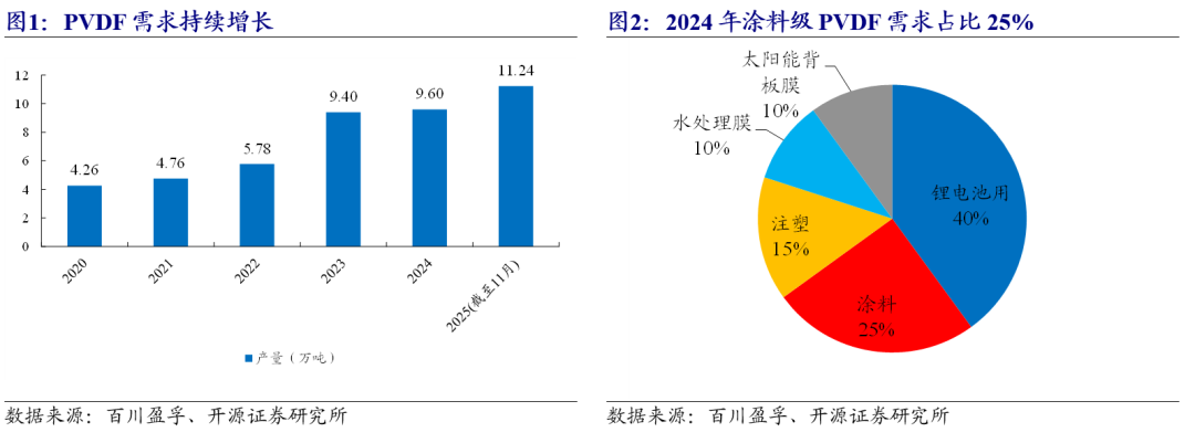又据百川盈孚数据,我国PVDF需求持续增长,截至2024年涂料级PVDF需求占比达25%。当前涂料PVDF价格已从3.6万元/吨反弹至4.9万元/吨,锂电级PVDF从4.9万元/吨反弹至5.2万元/吨。我们认为,头部企业停产或将继续助推PVDF价格的上涨,空间或较为可观。