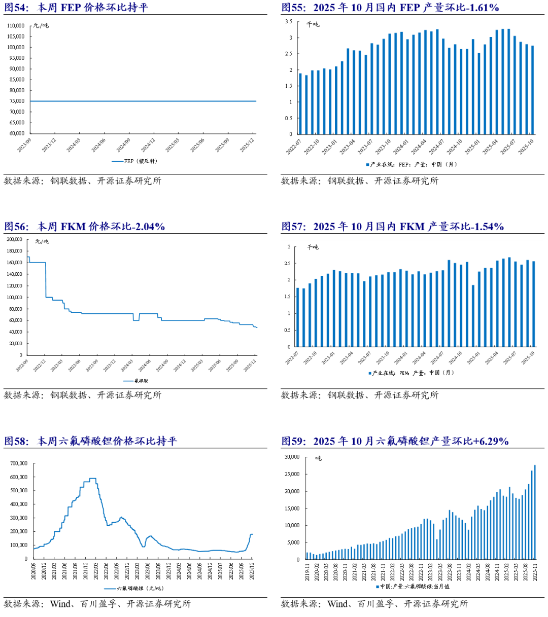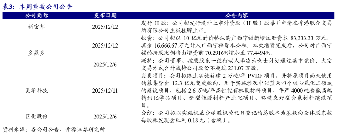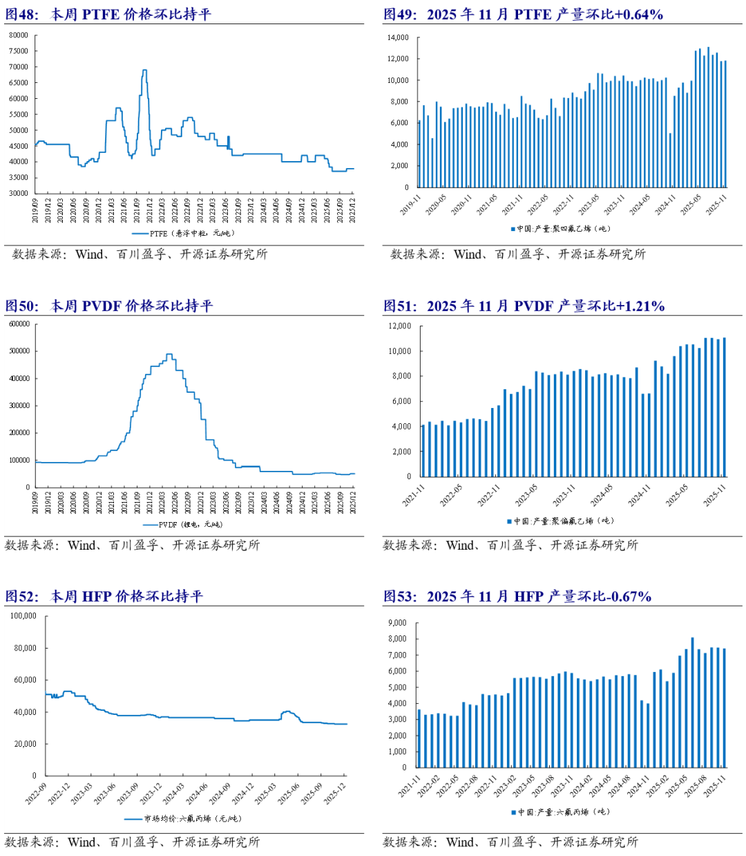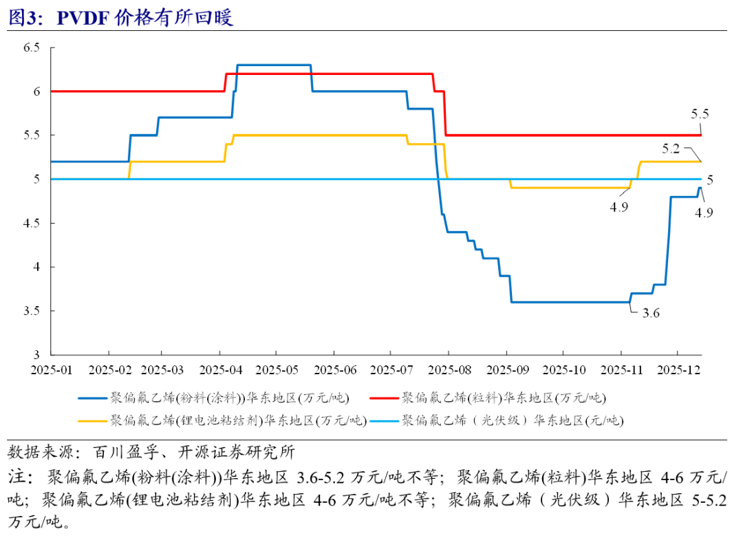 涂料级PVDF龙头企业停产,或对价格有一定影响。据华谊集团公告,公司下属控股子公司上海华谊三爱富新材料有限公司下属内蒙古三爱富万豪氟化工有限公司(以下简称“万豪公司”)收到丰镇市人民政府下发的《关于对内蒙古三爱富万豪氟化工有限公司全厂区进行停产治理的通知》。万豪公司主要生产F152a,F142b,FKM和PVDF等产品。本次停产预计将对万豪公司近期产量产生一定影响,公司将积极协调其他生产基地生产负荷,将影响降至最低。万豪公司2025年1-9月份营业收入7.79亿元,净利润-4124.23万元,营业收入占公司营业收入的2.16%(前述数据未经审计)。本次停产对公司2025年度经营数据不构成重大影响,具体影响以经审计的财务报告为准。又据公司发布的三爱富资产评估报告,公司涂料级PVDF国内市场占有率超过65%,并在锂电级PVDF领域与国际厂商(如Arkema、Solvay等)竞争,成为全球主要生产商之一。