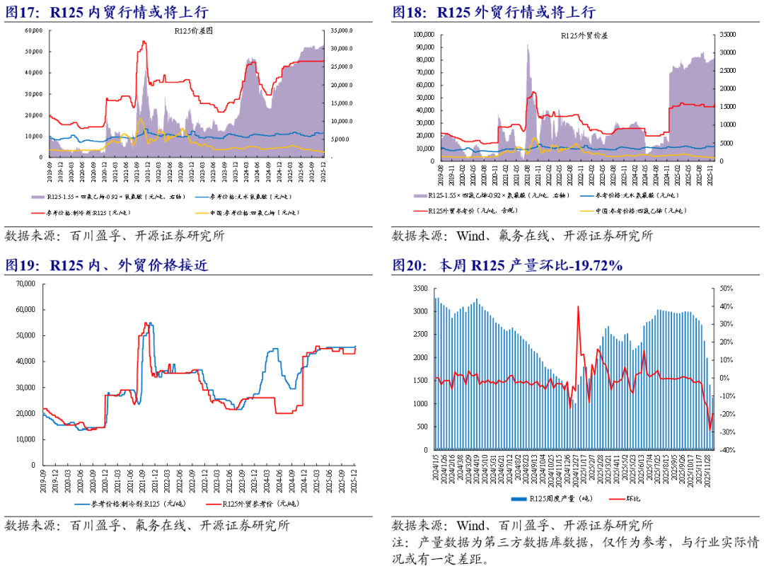 其中R125外贸市场,截至12月12日,R125外贸参考价格45,000元/吨,较上周同期 4.65%;价差为30,404元/吨,较上周同期 7.04%;12月外贸参考均价(截至12月12日)为44,000元/吨,环比 41.28%;2025年(截至12月12日)外贸参考价格为44,227元/吨,较2024年 76.22%。