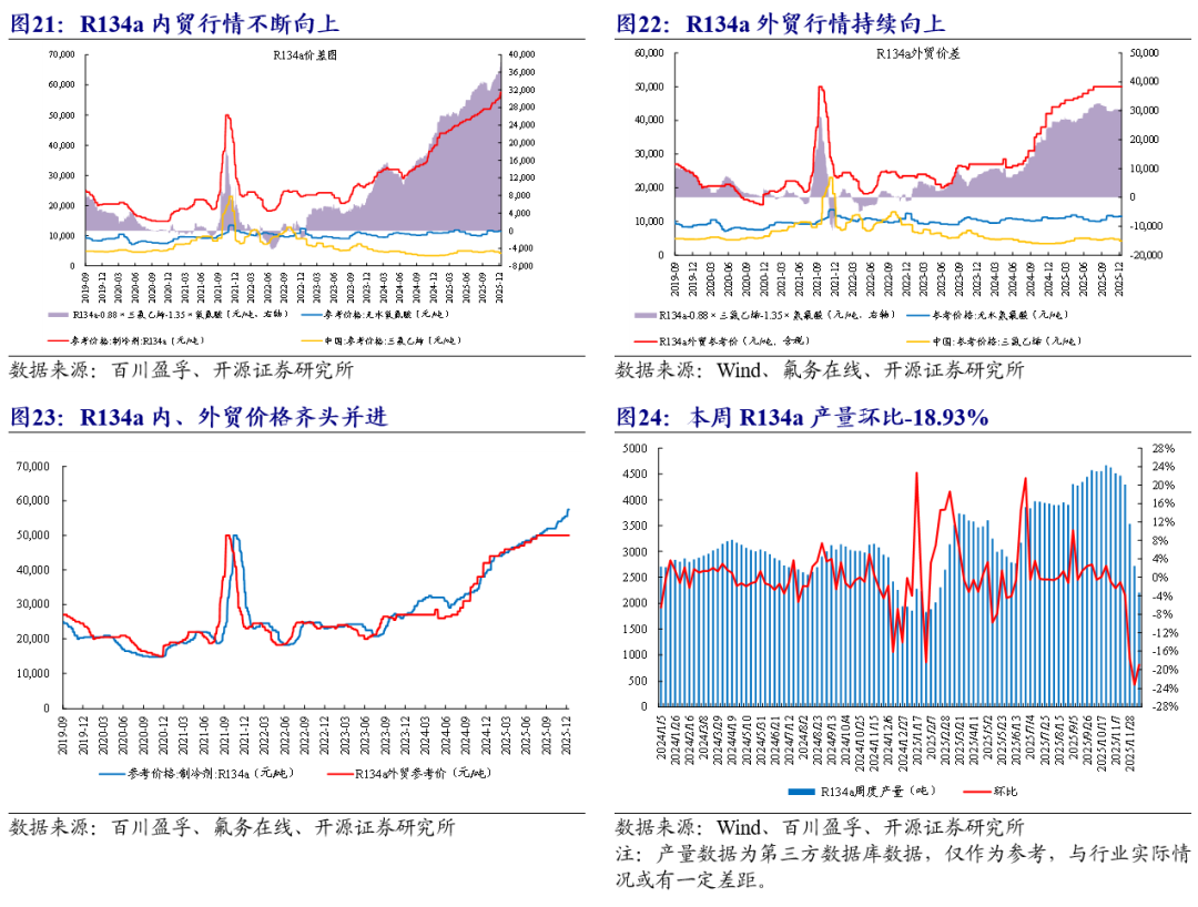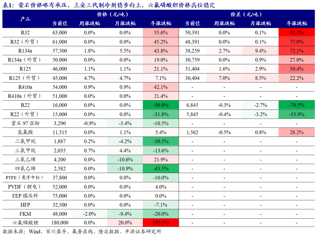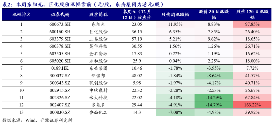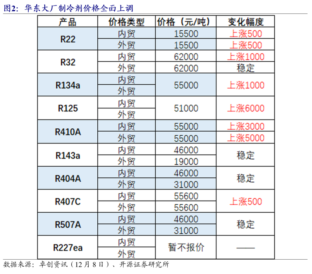 制冷剂:截至12月12日,(1)R32价格、价差分别63,000、50,391元/吨,较上周分别持平、-0.01%;(2)R125价格、价差分别46,000、31,404元/吨,较上周分别 1.10%、 1.62%;(3)R134a价格、价差分别57,500、38,259元/吨,较上周分别 1.77%、 2.68%;(4)R410a价格54,000元/吨,较上周 0.93%;(5)R22价格、价差分别16,000、6,845元/吨,较上周分别持平、-0.33%。其中外贸市场,(1)R32外贸61,000元/吨,较上周持平;(2)R125外贸45,000元/吨,较上周 4.65%;(3)R134a外贸50,000元/吨,较上周持平;(4)R410a外贸51,000元/吨,较上周持平。受益标的