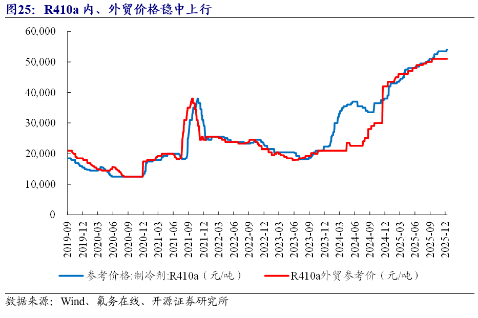 其中R410a外贸市场,截至12月12日,R410a外贸参考价格51,000元/吨,较上周同期持平;12月均价(截至12月12日)为51,000元/吨,环比 43.18%;2025年(截至12月12日)均价为48,345元/吨,较2024年均价 83.33%。