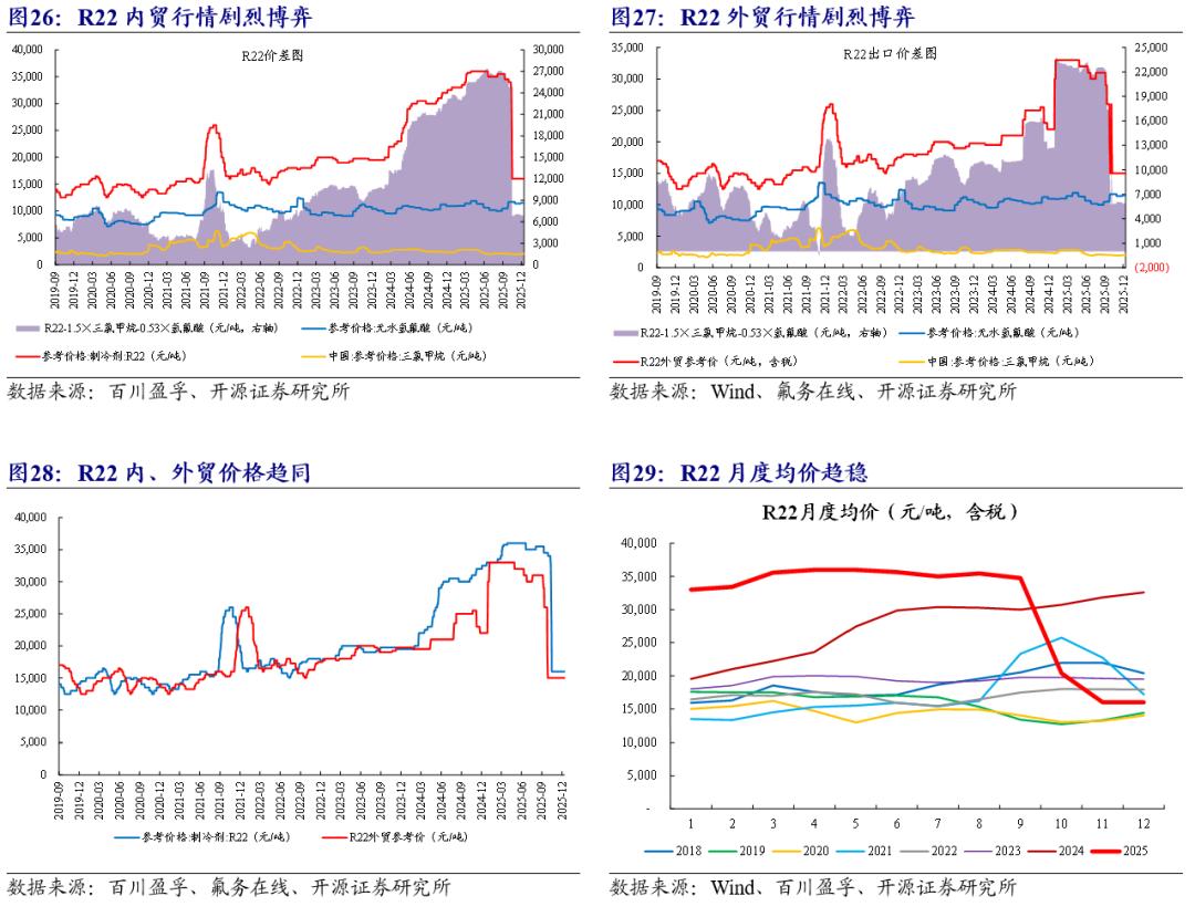 其中R22外贸市场,截至12月12日,R22外贸参考价格15,000元/吨,较上周同期持平;价差为5,845元/吨,较上周同期-0.38%;12月外贸参考均价(截至12月12日)为15,000元/吨,环比-35.78%;2025年(截至12月12日)外贸参考价格为27,220元/吨,较2024年 24.18%。