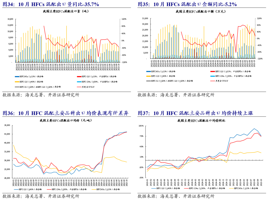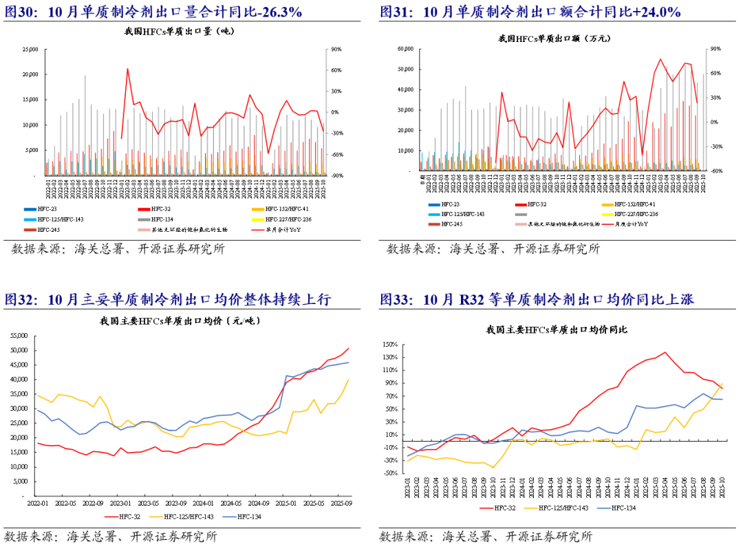 据海关总署数据,2025年1-10月我国HFCs单质制冷剂总出口量约为18.88万吨,同比-6.0%;出口总额约为80.46亿元,同比 51.7%。其中R32、R125/R143、R134出口量分别为51,479、10,711、92,392吨,分别同比 16.6%、-20.2%、-10.0%;出口均价分别为45,166、30,368、43,903元/吨,分别同比 107%、 33%、 60%。