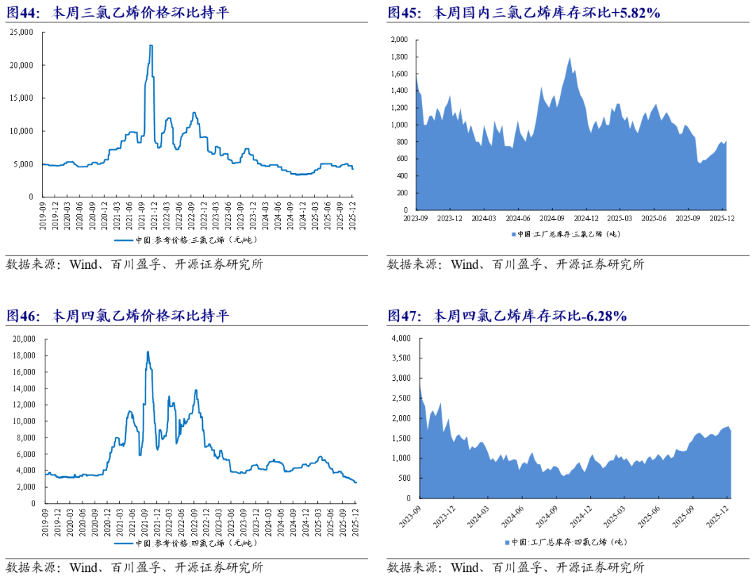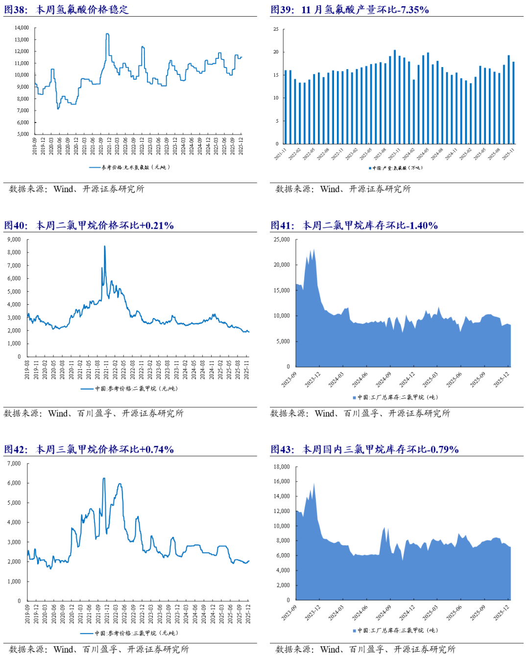 制冷剂:截至12月12日,(1)R32价格、价差分别为63,000、50,391元/吨,较上周分别持平、-0.01%;(2)R125价格、价差分别为46,000、31,404元/吨,较上周分别 1.10%、 1.62%;(3)R134a价格、价差分别为57,500、38,259元/吨,较上周分别 1.77%、 2.68%;(4)R410a价格为54,000元/吨,较上周 0.93%;(5)R22价格、价差分别为16,000、6,845元/吨,较上周分别持平、-0.33%。