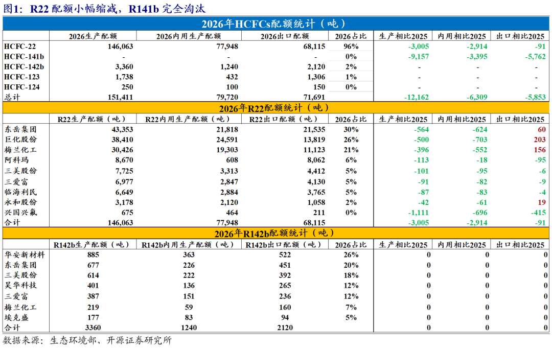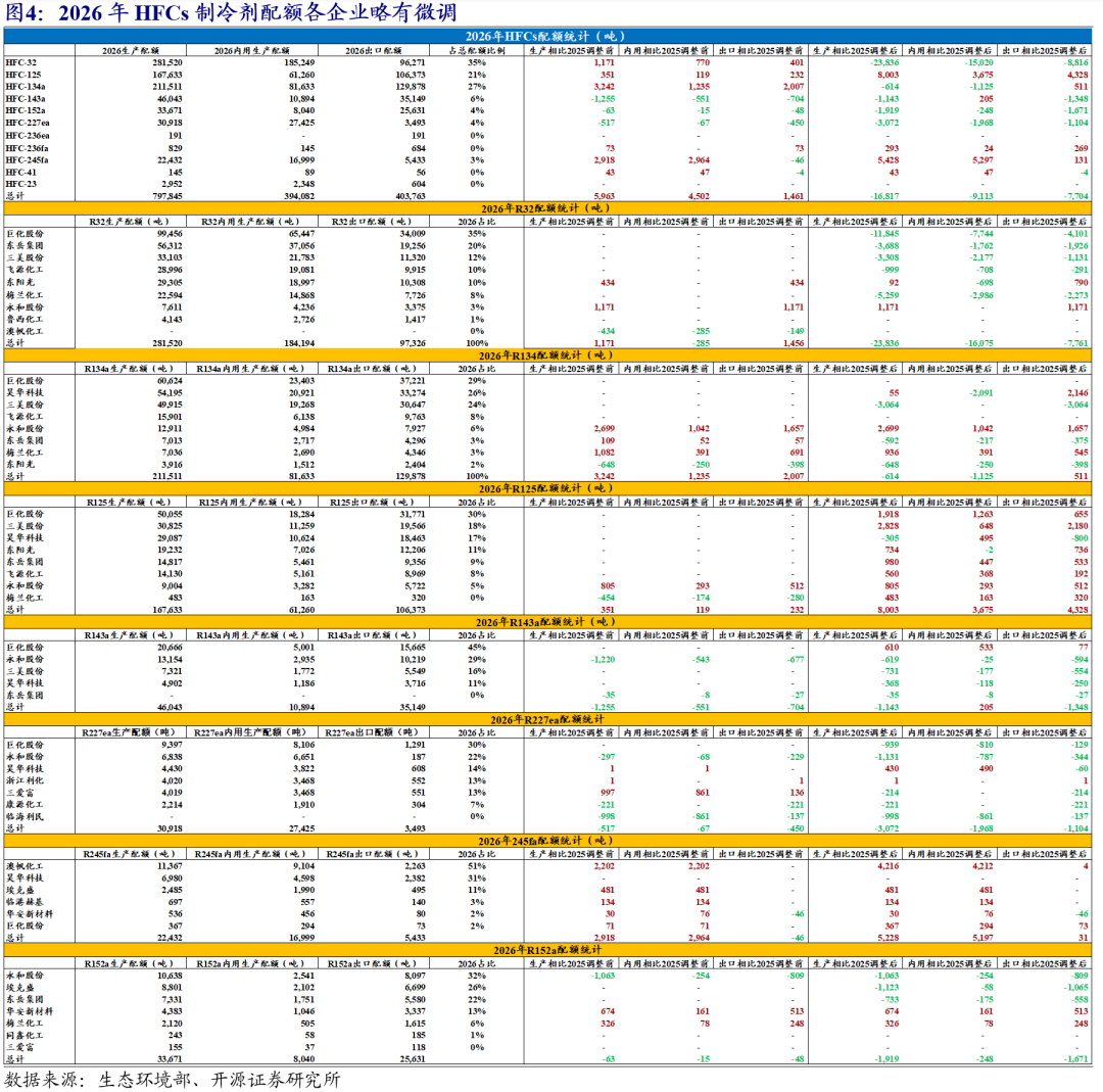 生态环境部发布2026年制冷剂配额方案,整体与2025年初变化不大。R32:2026下发配额相比2025年初 1171吨,相比2025调整后-23836吨;R134a:2026下发配额相比2025年初 3242吨,相比2025调整后-614吨;R125:2026下发配额相比2025年初 351吨,相比2025调整后 8003吨;R143a:2026下发配额相比2025年初-1255吨,相比2025调整后-1143吨;R227ea:2026下发配额相比2025年初-517吨,相比2025调整后-3072吨。整体来看,各家对10%→30%切换比例的变化并没有太多动作,非常克制、有序。