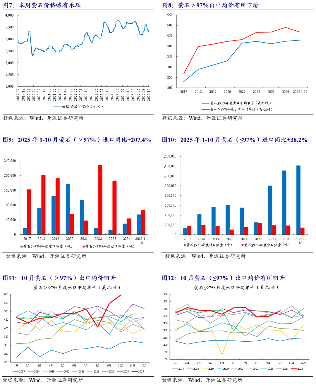 萤石:据百川盈孚,截至12月12日,萤石97湿粉市场均价3,290元/吨,较上周下跌0.87%;12月均价(截至12月12日)3,312元/吨,同比下跌9.83%;2025年(截至12月12日)均价3,482元/吨,较2024年均价下跌1.78%。