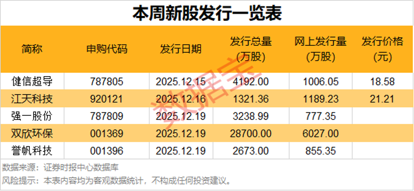 日程安排上,周一(12月15日)可申购健信超导,周二可申购江天科技,周五可申购双欣环保、誉帆科技、强一股份。