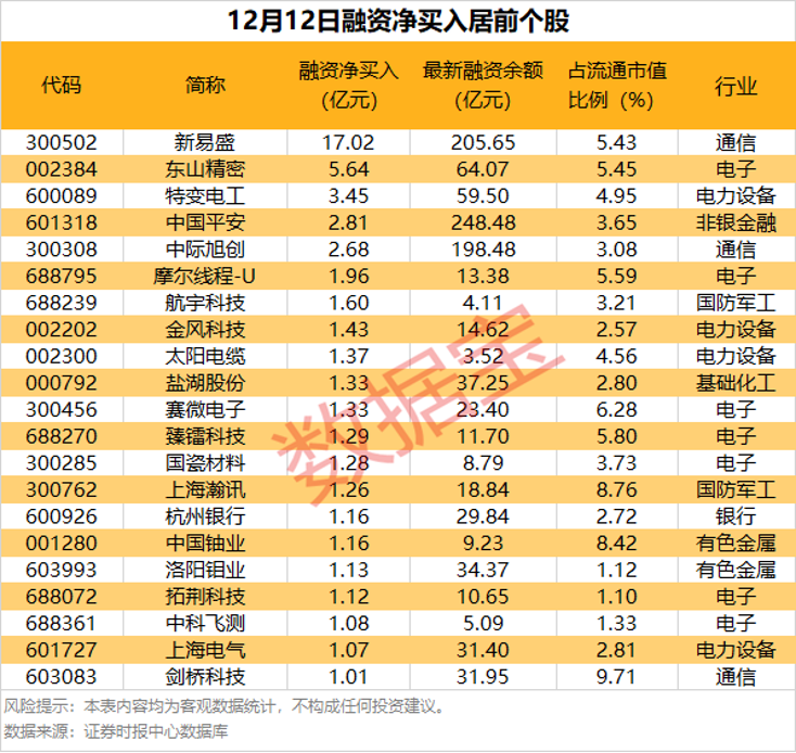 具体到个股,12月12日获融资净买入千万元以上的有378股,其中21股融资净买入额均超1亿元。