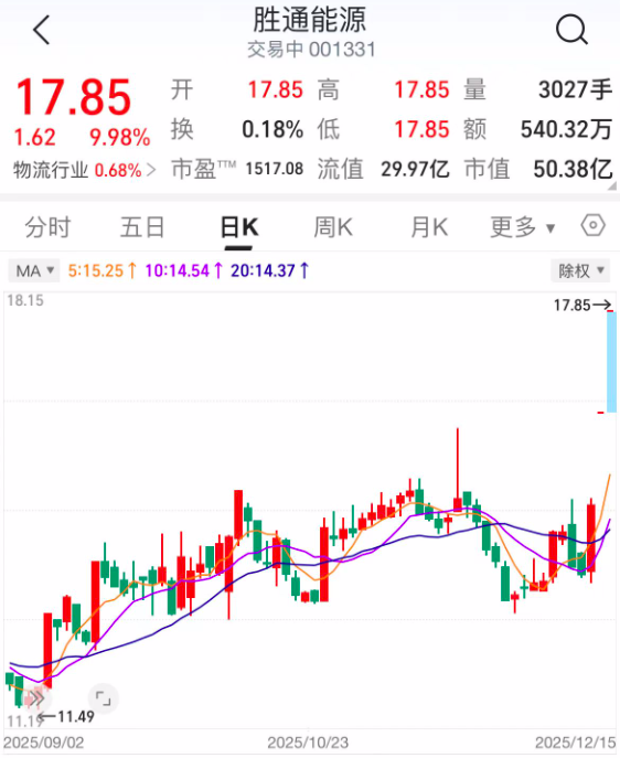 消息传出后,胜通能源复牌一字涨停连板,截至12月15日收盘,报收17.85元/股,总市值达50.38亿元,年内股价实现翻倍。