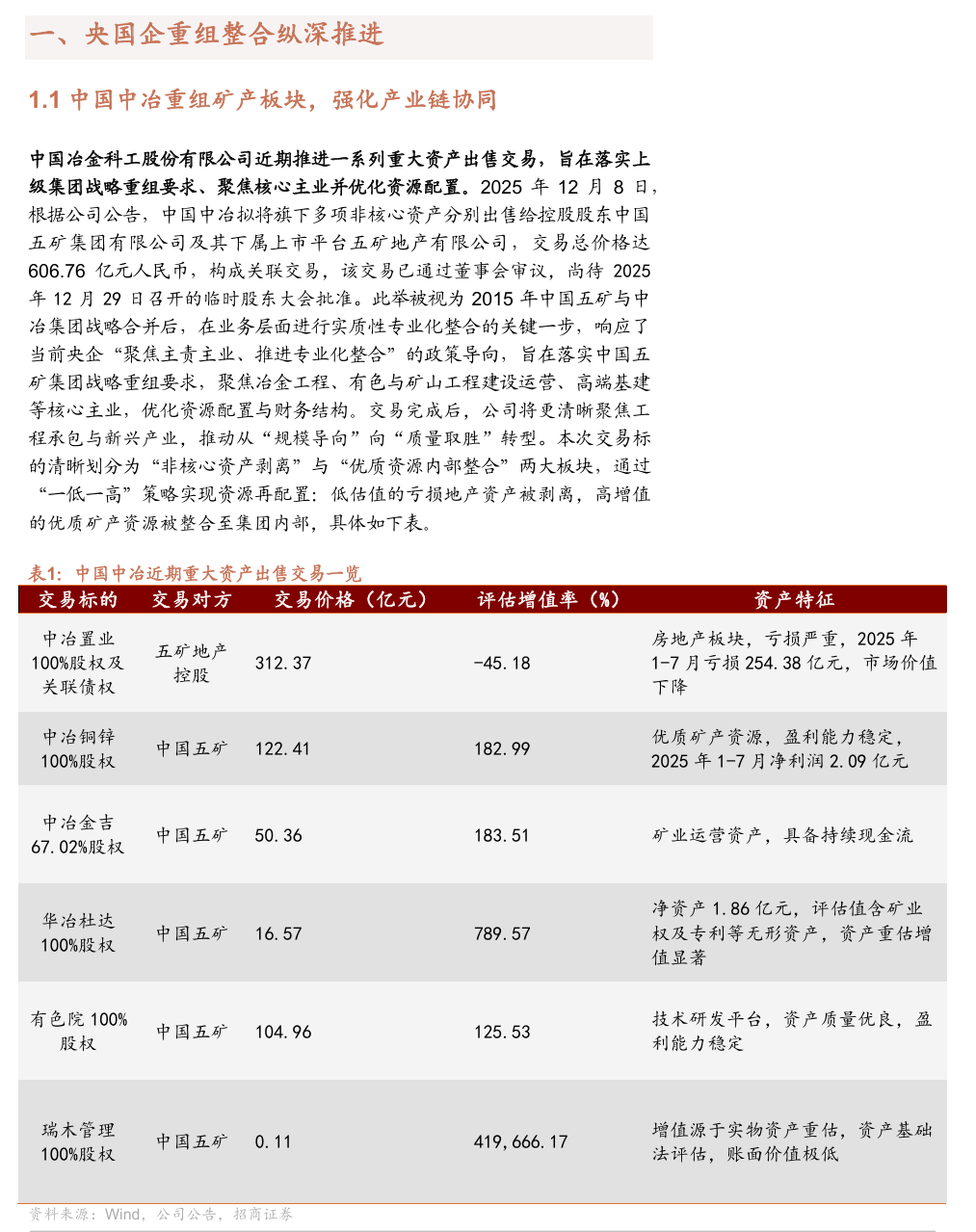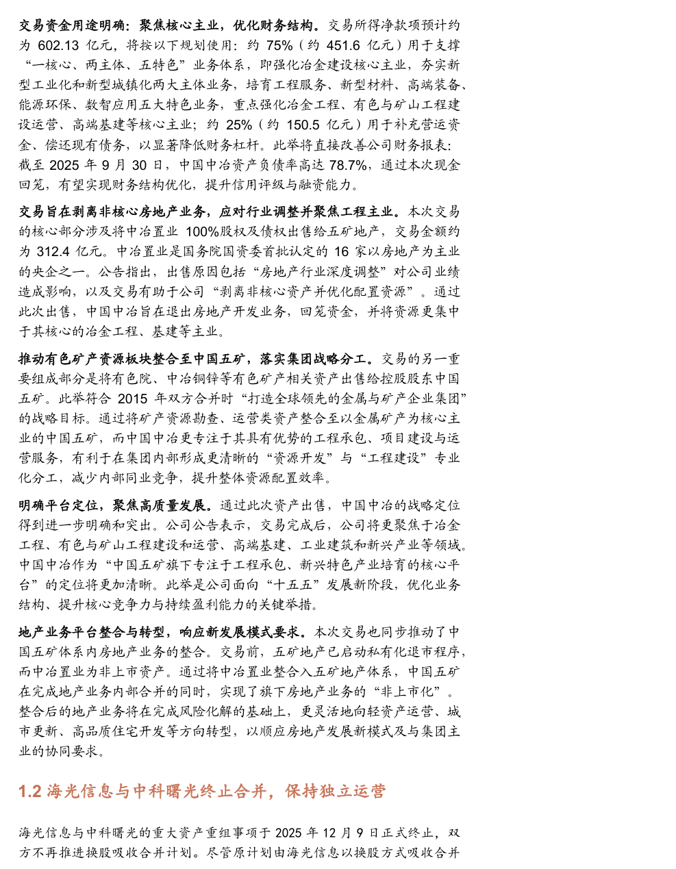 聚焦主业与审慎决策并存。央企专业化整合持续推进,路径呈现分化。一方面,中国中冶以逾600亿元交易剥离地产、整合矿产资源,坚决回归工程承包核心主业响应了传统领域“聚焦主责主业”的刚性要求。另一方面,海光信息与中科曙光的千亿级吸收合并因市场估值剧烈波动而审慎终止。