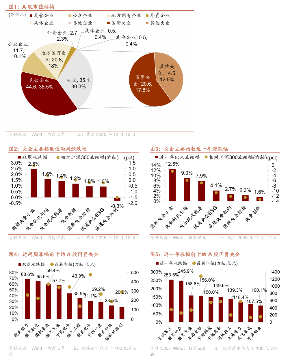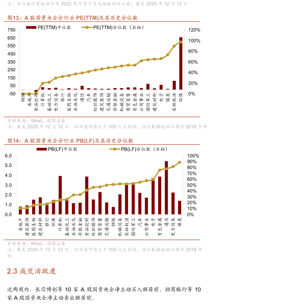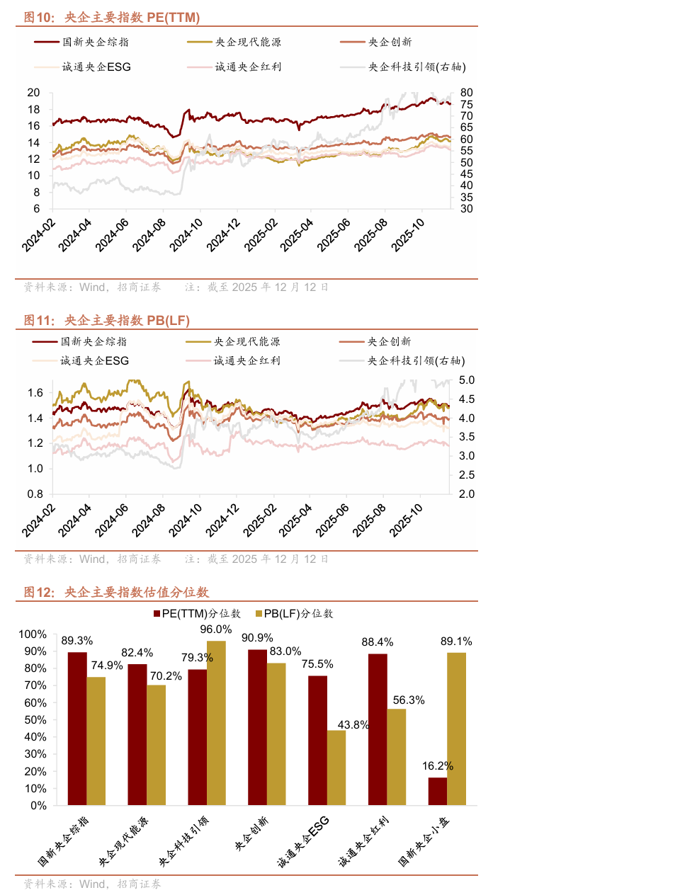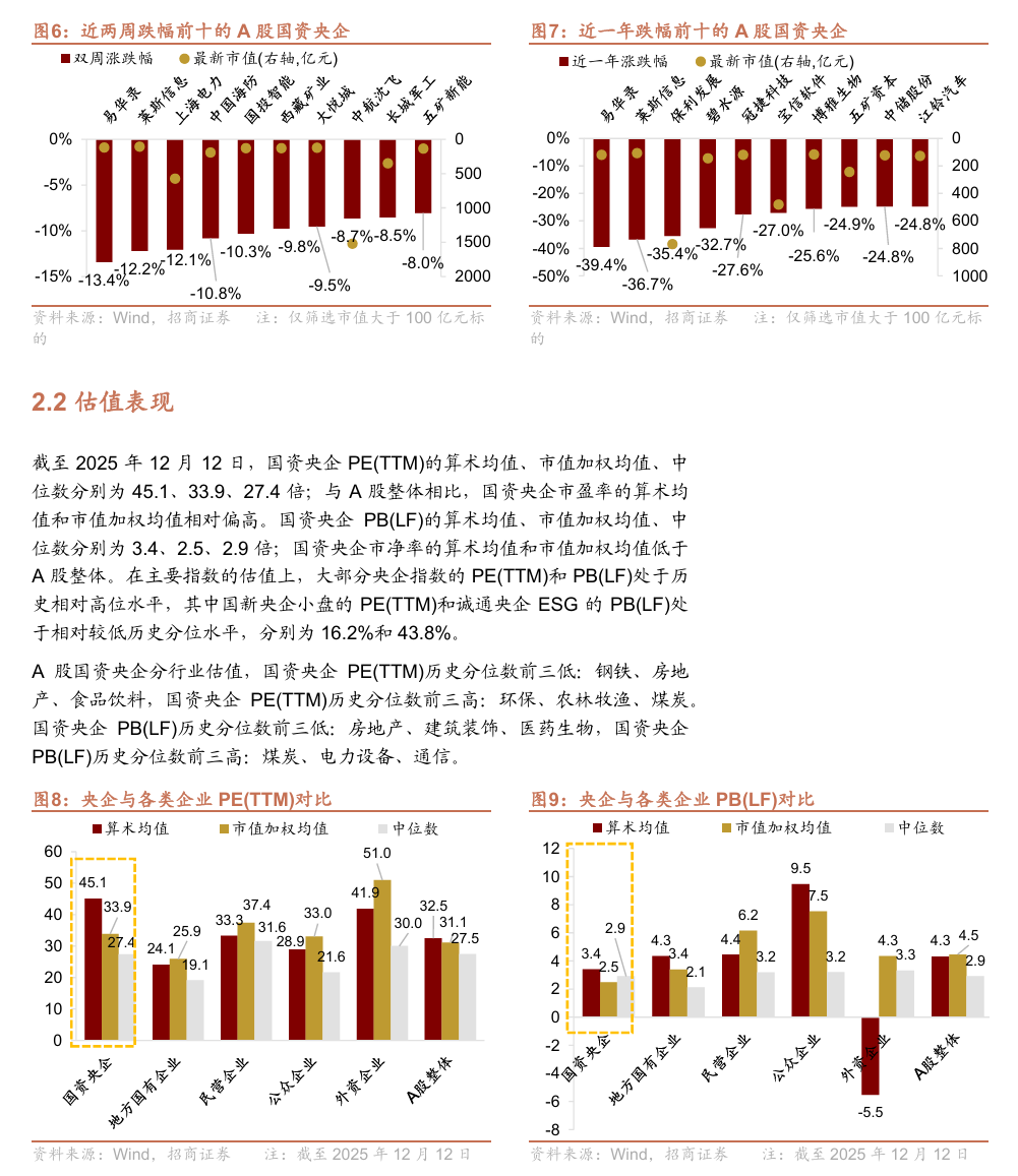 截至2025年12月12日,国资央企PE(TTM)的算术均值、市值加权均值、中位数分别为45.1、33.9、27.4倍;与A股整体相比,国资央企市盈率的算术均值和市值加权均值相对偏高。国资央企PB(LF)的算术均值、市值加权均值、中位数分别为3.4、2.5、2.9倍;国资央企市净率的算术均值和市值加权均值低于A股整体。