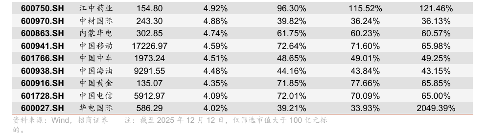 截至2025年12月12日,A股国资央企股息率的算术均值、市值加权均值、中位数分别为1.2%、3.0%、0.5%,股息率的市值加权均值明显高于A股整体以及其他类型企业。