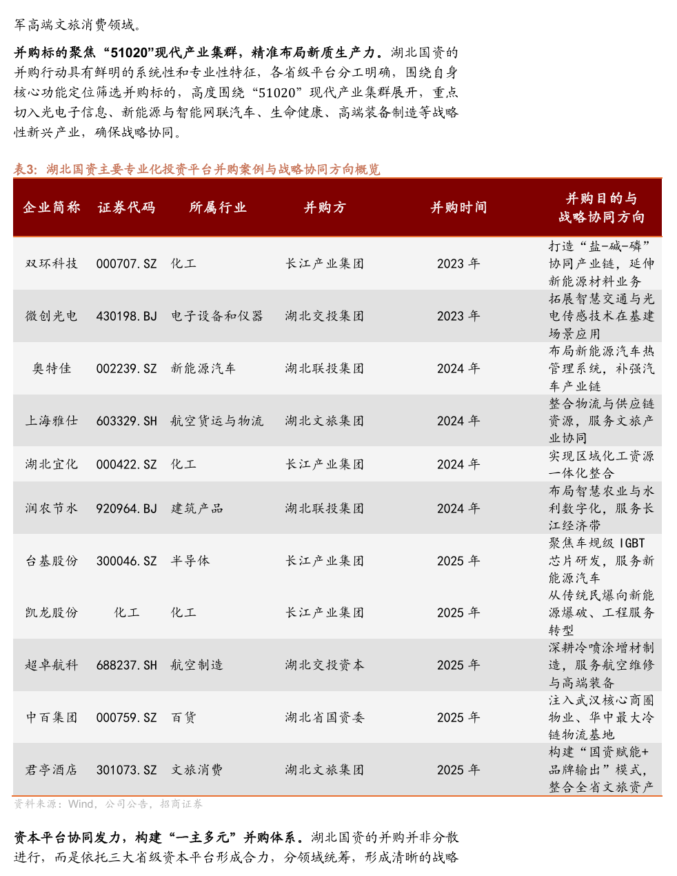 地方实践并购联动“三资”改革。地方国资成为资本市场活跃力量。湖北国资最为典型,通过长江产业集团、湖北文旅等专业化平台分赛道并购,控股上市公司约15家,并计划将资产注入与“三资”(资源、资产、资金)盘活改革深度绑定,构建“并购—整合—赋能”的价值闭环。
