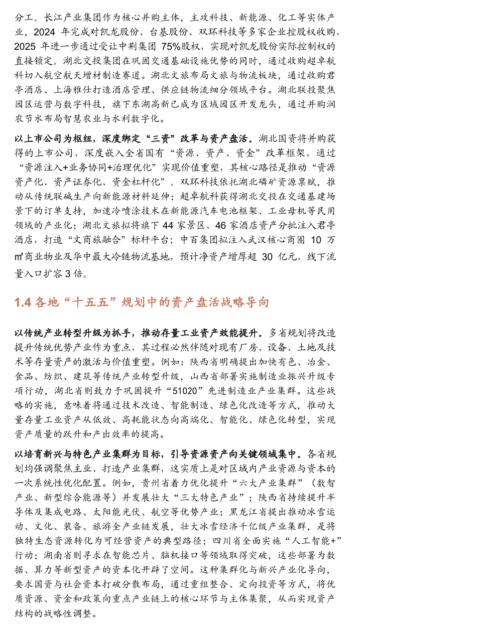 “十五五”规划锚定资产盘活路径。多地“十五五”规划建议将资产盘活内嵌于产业升级战略。路径包括:推动传统工业资产转型升级、引导资源向新兴产业集群集中、通过区域协同优化资产空间配置,以及将特色生态资源转化为可经营资产,为下一阶段的国资运作提供了清晰的战略指引。