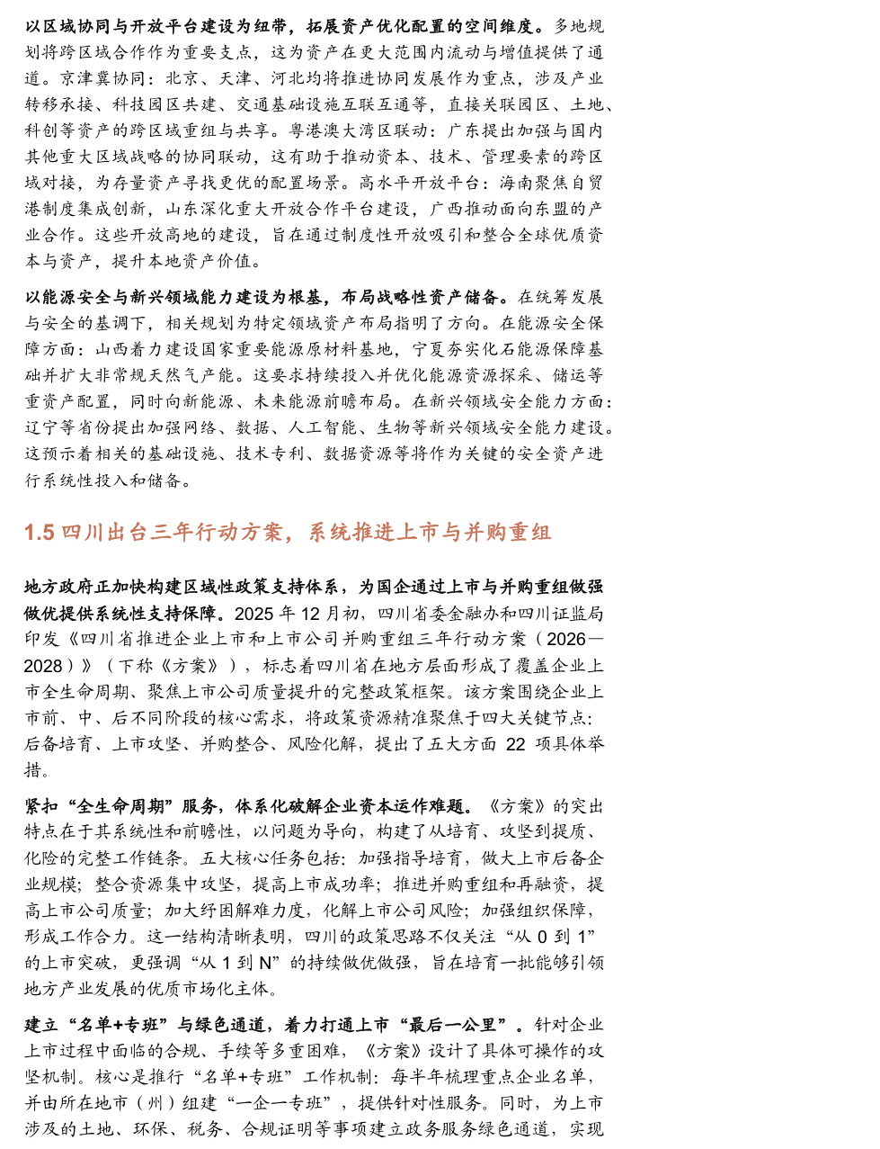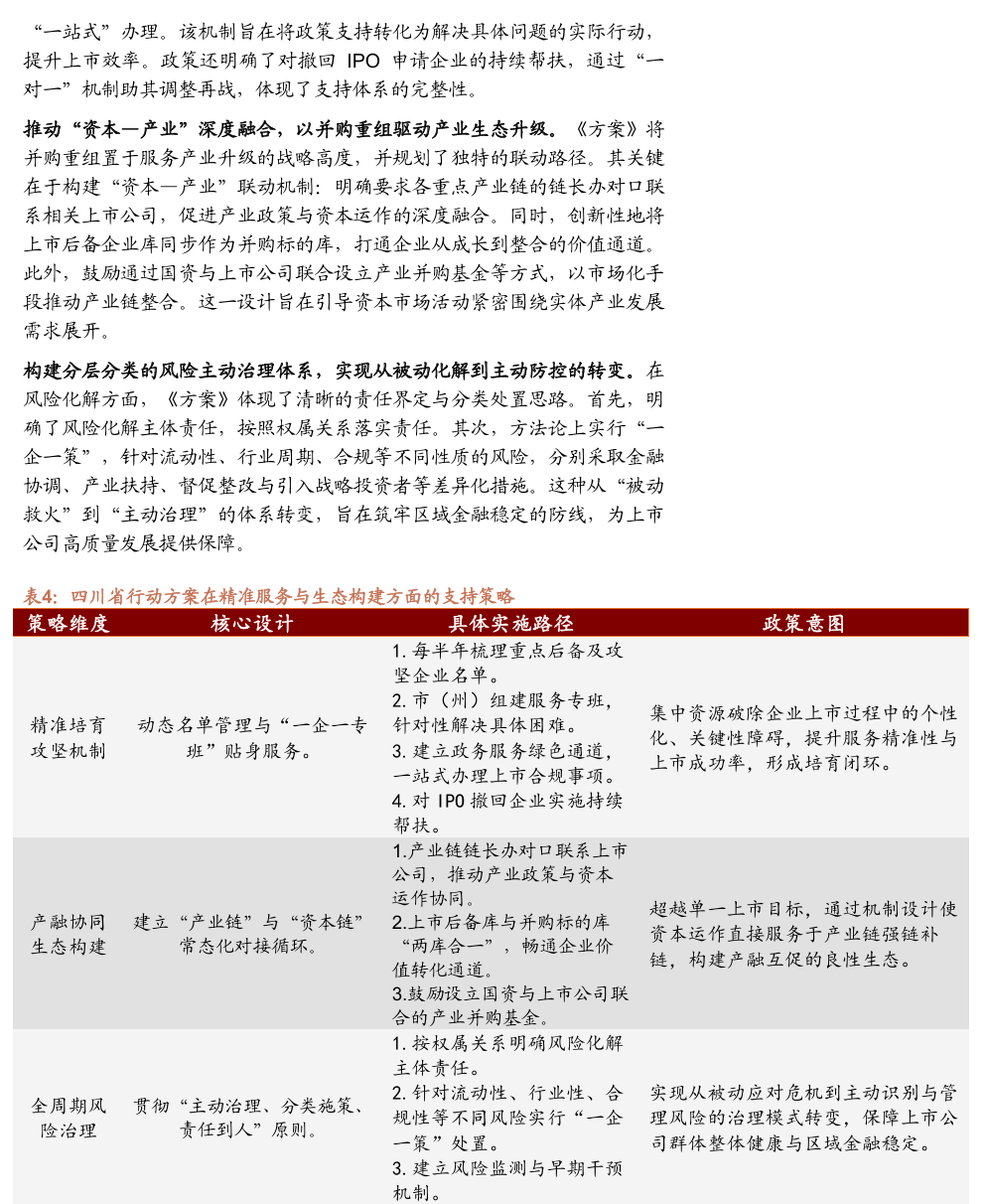 四川省探索构建全生命周期服务体系。四川省最新出台的上市与并购重组三年行动方案,创新性建立“名单 专班”机制与“资本—产业”联动,旨在打通企业上市“最后一公里”,并对风险实施“一企一策”的主动治理,代表了地方服务实体经济能力的升级。