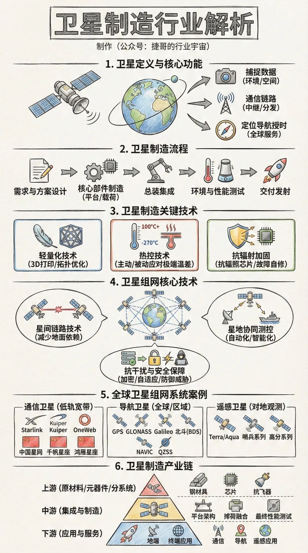 卫星制造产业链的上游主要包括:铝合金、碳纤维等原材料供应;射频芯片、处理器、存储器等核心元器件制造;以及各类卫星分系统(如能源系统、姿态控制系统、推进系统、热控系统、通信系统等)。