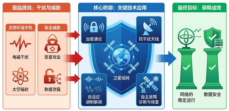 卫星组网在太空环境和地面应用中面临多种干扰和安全威胁。因此需采用加密通信、抗干扰天线、自适应调制解调、卫星自主故障诊断与修复等技术,保障网络的稳定运行与数据安全。