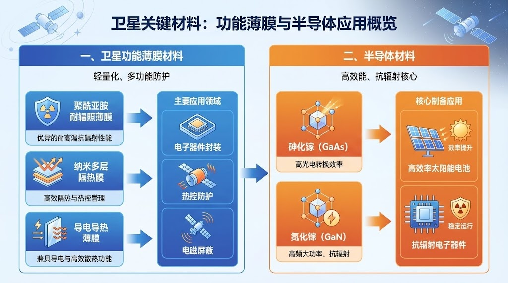 功能薄膜材料,如聚酰亚胺耐辐照薄膜、纳米多层隔热膜、导电导热薄膜等,用于电子器件封装、热控防护与电磁屏蔽。半导体材料以砷化镓(GaAs)、氮化镓(GaN)等化合物半导体为主,用于制备高效率太阳能电池与抗辐射电子器件。