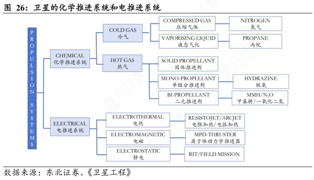 推进系统分为化学推进(液体/固体推进器)与电推进(离子推进器、霍尔推进器),用于轨道转移与姿态修正,电推进系统具有高效、长寿命优势。