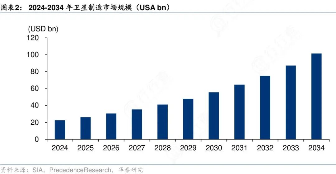 根据美国卫星行业协会(SIA)和PrecedenceResearch数据,2024年全球卫星制造收入增长至200亿美元,比2023年增长17%。预计2030年全球卫星制造市场规模将达到570亿美元。