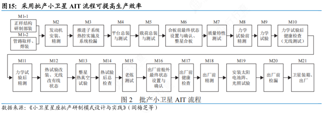 卫星制造首先要进行需求分析与方案设计,明确组网适配的功能、轨道等参数;之后进行核心部件制造,涵盖卫星发射平台(姿控、能源等)与载荷(通信、导航等)研发。