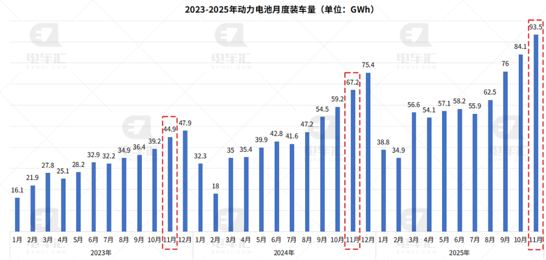 最新数据显示,2025年11月,我国动力电池装车量达93.5GWh,同比增长约39.2%(对比2024年11月的67.2GWh),环比增长11.2%,创下历史新高,延续了今年以来逐月攀升的态势。