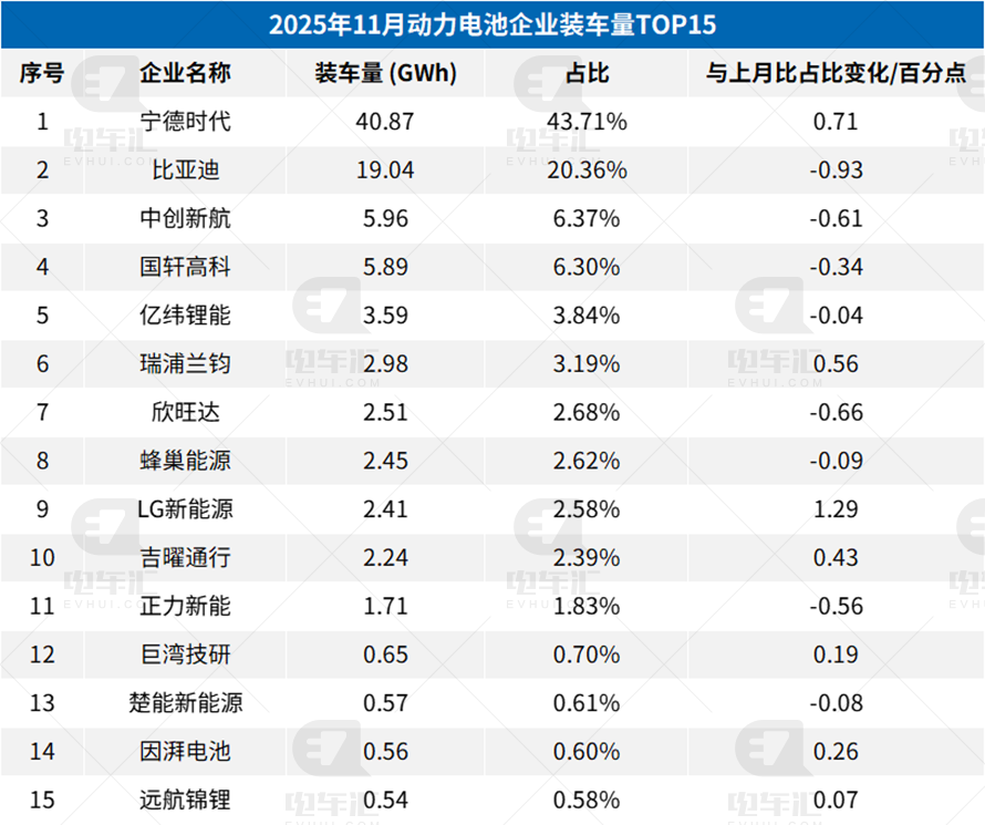 2025年11月动力电池企业装车量TOP15