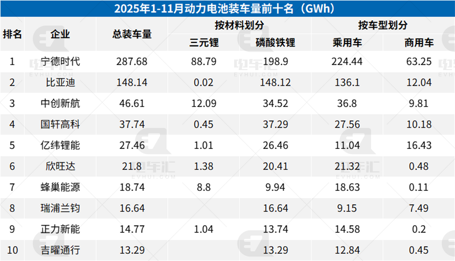 2025年1-11月动力电池装车量前十名(GWh)
