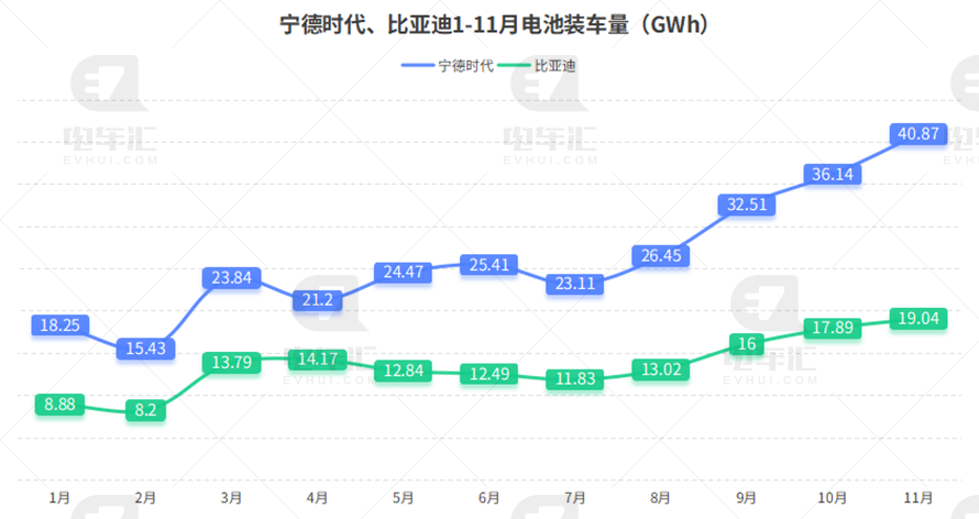 紧随其后的是比亚迪,11月装车量为19.04GWh,市占率20.36%,虽环比微降0.93个百分点,但凭借自供体系优势,全年累计装车量已达148.14GWh,巩固其第二位置。