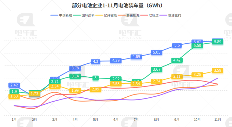 部分电池企业1-11月电池装车量(GWh)
