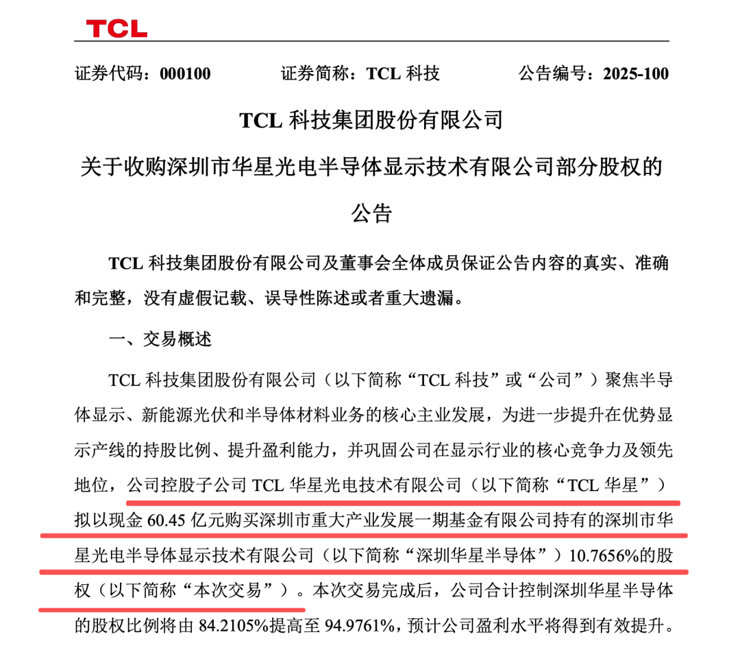 TCL科技加快高世代产线公司少数股权收购,上市公司归母净利润将进一步增厚。12月15日,TCL科技(000100)发布公告,控股子公司TCL华星光电技术有限公司(简称“TCL华星”)拟以现金60.45亿元购买深圳市重大产业发展一期基金有限公司持有的深圳市华星光电半导体显示技术有限公司(简称“深圳华星半导体”)10.7656%的股权。交易完成后,公司合计控制深圳华星半导体的股权比例将由84.2105%提高至94.9761%,预计公司盈利水平将得到有效提升。根据公告,深圳华星半导体聚焦半导体显示业务,旗下拥有两条全球最高世代G11显示面板生产线,即TCL华星t6、t7工厂,主要从事大尺寸TFT-LCD显示器件的生产、加工与销售,主要产品为大尺寸TFT-LCD显示器件,并根据客户需求提供定制化生产服务,产品主要应用于电视机、商显等领域。本次对深圳华星半导体少数股权的收购,将有利于TCL科技进一步强化主业,提升其在半导体显示行业的核心竞争力。资产质量方面,公告披露,截至2024年12月31日,深圳华星半导体总资产680.40亿元,净资产448.50亿元;2024年实现营业收入241.58亿元,净利润28.07亿元。截至2025年6月30日,深圳华星半导体总资产647.69亿元,净资产465.64亿元;2025年1—6月实现营业收入120.23亿元,实现净利润17.09亿元。资产负债率逐步下降、净利润率持续增长,表明标的资产盈利能力持续强化,质量优异。据了解,近年来半导体显示大尺寸行业格局进一步优化,供需关系趋向健康,大尺寸化驱动面积需求稳步增长。进入年底,电视面板市场开始迎来备货旺季。12月初,TrendForce集邦咨询发布本月面板价格预测,12月电视面板价格预计全面止跌。展望后市,12月11日闭幕的中央经济工作会议明确2026年将优化“两新”政策实施。所谓“两新”政策,是指大规模设备更新和消费品以旧换新政策,其中消费品以旧换新政策被称为“国补”。会议明确了2026年会“国补”政策将继续实施,有望拉动消费电子终端及上显示面板需求增长。值得一提的是,2026年由美国、加拿大与墨西哥联合承办的国际足联世界杯赛事将于6月拉开帷幕。资料显示,本次世界杯参赛队伍将扩至48支,比赛场次增至104场,赛程延长至40天,创下历史规模之最。市场普遍认为,顶级国际体育赛会有望对电视面板尤其大尺寸电视面板需求形成强力催化作用。深圳华星半导体聚焦于大尺寸LCD面板生产与销售,有望深度受益。市场人士指出,在大尺寸显示产品需求爆发前夕完成对优质高世代产线的收购,无疑直接锁定了丰厚利润。TCL科技在公告中表示,本次收购完成后,公司在深圳华星半导体的权益比例将得到提升,进一步提高归属上市公司股东的利润水平,有利于上市公司股东更好地分享深圳华星半导体实现的经济效益。