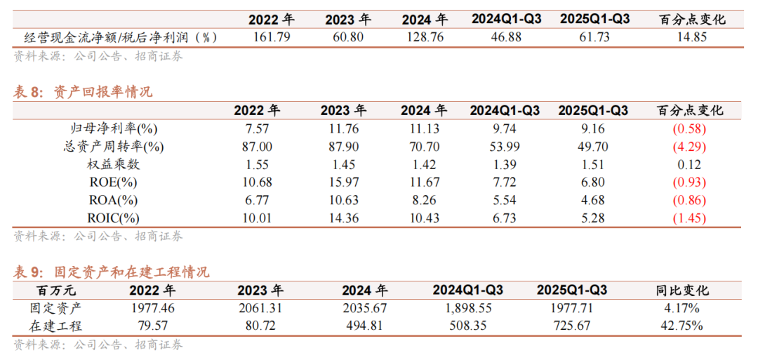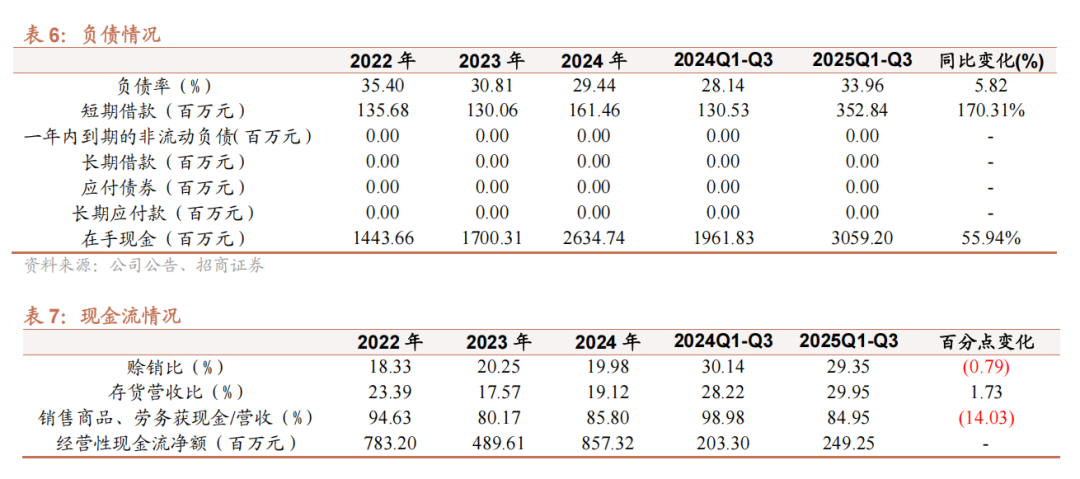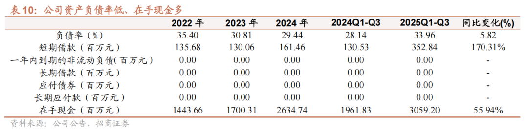 现金流强劲,在手现金超30亿。公司经营现金流持续改善,前三季度经营现金流净额达2.49亿元,同比增长22.60%,其中Q3现金流入显著,带动经营现金流/净利润比率提升至61.73%。且公司Q3期末货币资金为30.59亿元,同比增长15.94%,流动资金充裕。尽管短期借款有所增加,但公司持续投入在建工程(同比增长46.66%至7.26亿元),为未来产能扩张奠定基础。