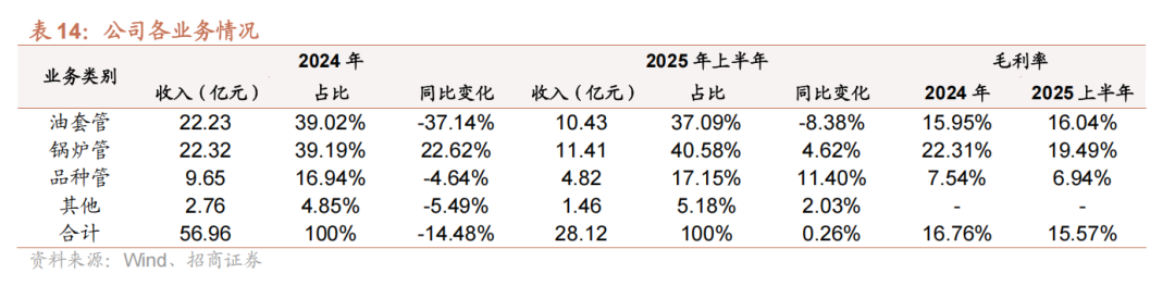 2)锅炉管业务:增长最强劲,受发电行业政策驱动。2024年全年收入占比39.19%,同比增长22.62%;2025年上半年占比40.58%,同比增长4.62%。毛利率相对较高,但今年有略微下滑,2025上半年为19.49%,同比-1.99pcts。
