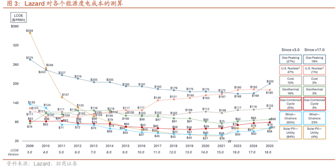 热电联产燃气轮机是美国成本领先的基荷电源。美国天然气资源丰富,根据EIA数据,天然气发电占比高达46.4%(2024年),位居全球第一。根据Lazard的测算,热电联产燃气轮机的度电成本仅次于光伏、陆风。但是风、光发电存在波动性和随机性,必须配置一定比例储能,才能在日内达到和燃气发电等价的发电曲线,总成本将高于热电联产燃气轮机发电。