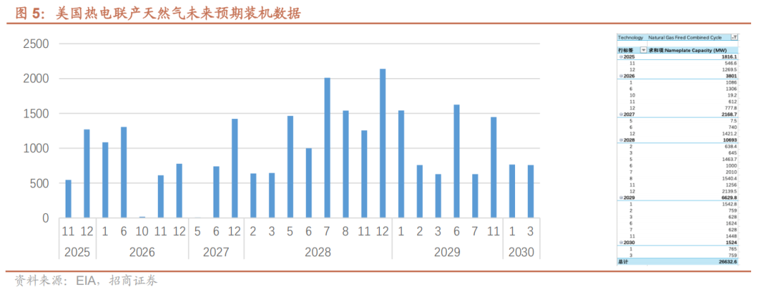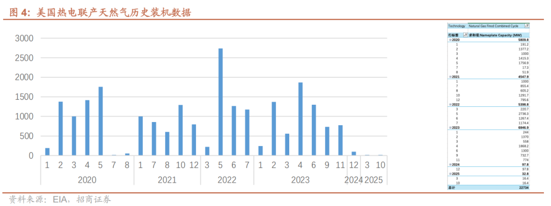 未来几年美国燃气发电并网项目有望大幅增加。根据EIA数据,2020–2023年美国热电联产燃气轮机年新增并网量保持在4–7GW,这主要得益于特朗普上任期间规划的天然气项目陆续完工。2024–2025年预计年新增并网不足100MW,与拜登政府推动清洁能源的政策有关。当前特朗普政府正再度推动天然气项目,预计2028–2029年将迎来并网高峰,2028年当年并网量有望超过10GW。