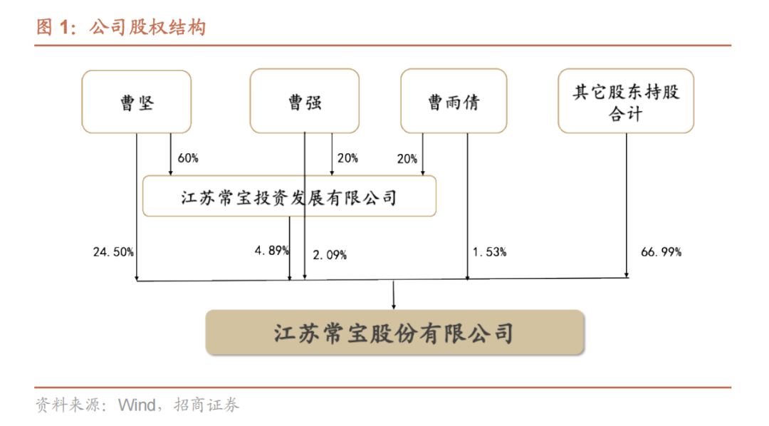 公司股权结构稳定,董事长曹坚家族通过一致行动关系合计持有 33.01%的股权。公司实际控制人为董事长曹坚,根据三季报数据,其直接持股 24.50%。其直系亲属曹雨倩(女儿),直接持股 1.53%,曹强(弟弟)直接持股 2.09%,三人为一致行动人。此外,三人还通过分别持有常宝投资的股权(曹坚 60%,曹强 20%,曹雨倩 20%),间接合计持有公司 4.89%的股权。三人目前合计持有公司 33.01%的股权。