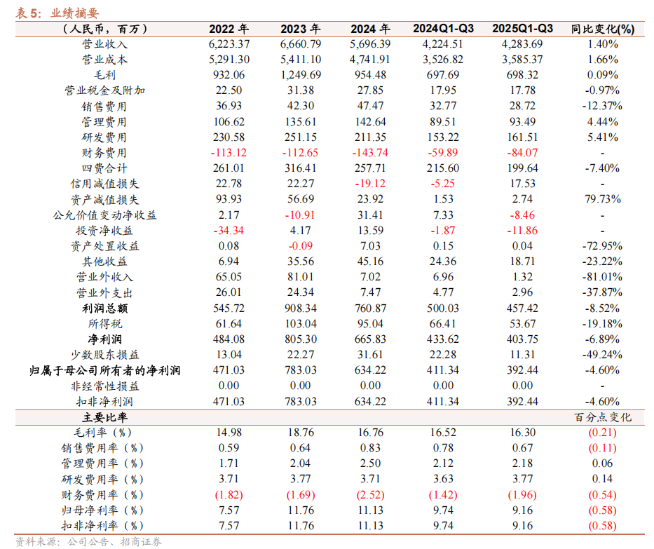 前三季度业绩增速一般,但Q3已看到明显拐点。公司25年前三季度业绩表现一般,前三季度营收为42.84亿元,同比增长1.40%;归母净利润为3.92亿元,同比下降4.60%;扣非净利润为3.53亿元,同比增长0.80%。Q3业绩表现亮眼,业绩有明显拐点。单Q3营收14.72亿元,同比增长3.66%;归母净利润1.38亿元,同比增长61.15%;扣非净利润1.34亿元,同比增长40.60%。
