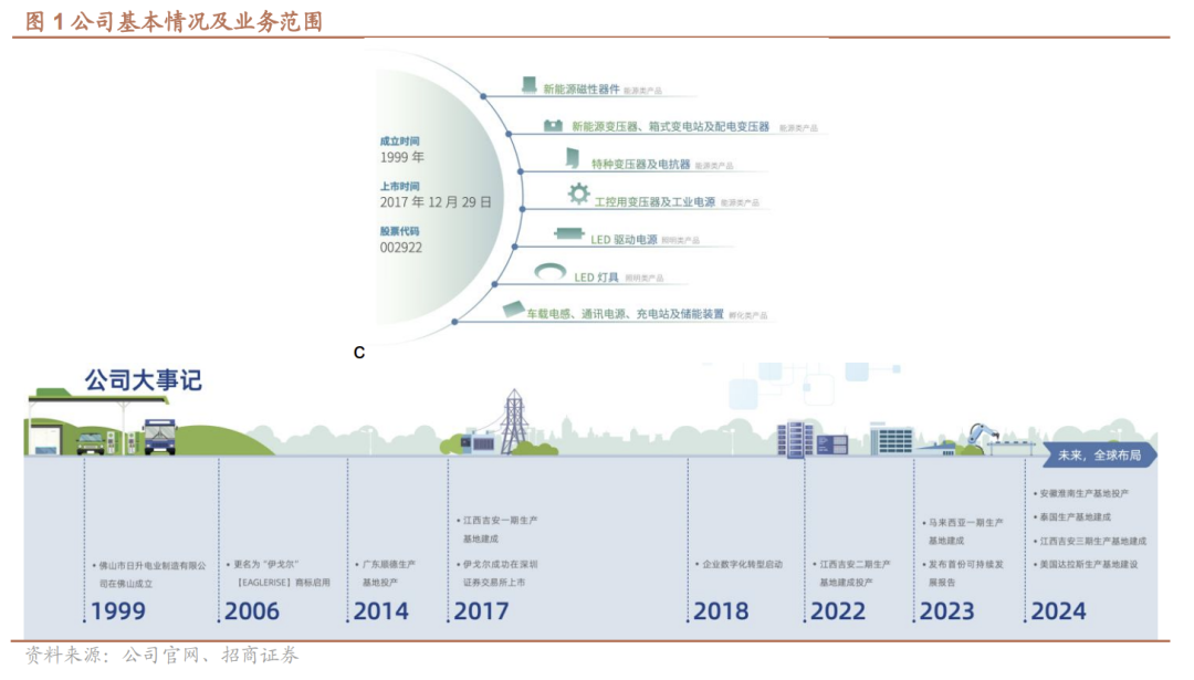 公司成立于1999年,从照明业务(LED驱动电源、灯具)起步,并逐步拓展至工业控制变压器、新能源磁性器件/变压器、特种变压器、配电变压器、车载电感/电源等领域,变压器产品涵盖油浸式、干式、箱变和移相变等完整体系。
