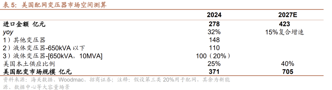 2027年美国配电变压器市场规模预计约700亿元。2024年美国配电变压器进口金额约280亿元,连续三年实现高增长。2025年进口增速出现下滑,预计与美国本土供应能力逐步恢复有关。假设40%本土供应能力及15%进口复合增速,测算2027年美国配电变压器市场规模约700亿元。