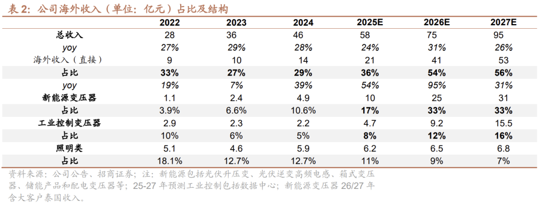 从产品出海到产能出海,预计带动变压器海外直销占比提升。公司近几年前瞻布局海外变压器产能,2024年以来泰国、美国工厂陆续建成投产,墨西哥工厂预计2026年投产,海外整体产值预计超30亿元。公司过去主要跟着大客户出海,近两年拓展了国内其他新能源客户,且海外直销客户也有明显增长,客户结构逐步多元化,大客户比例下降。