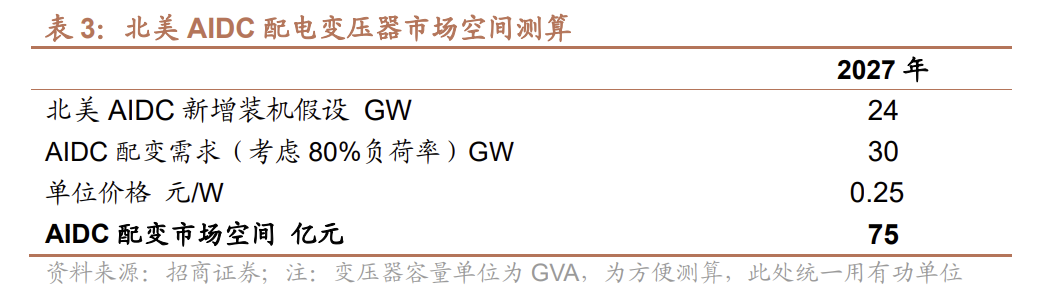AIDC建设催生配电变压器增量需求。以建设进度和体量最大的北美市场为例,预计2027年AIDC新增容量将达到24GW,考虑80%左右的负荷率,配电变压器新增需求预计30GW。按照0.25元/W单价测算,北美AIDC配电变压器市场规模约75亿元。