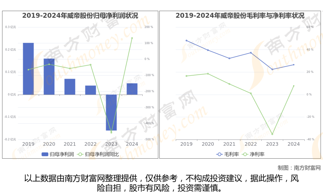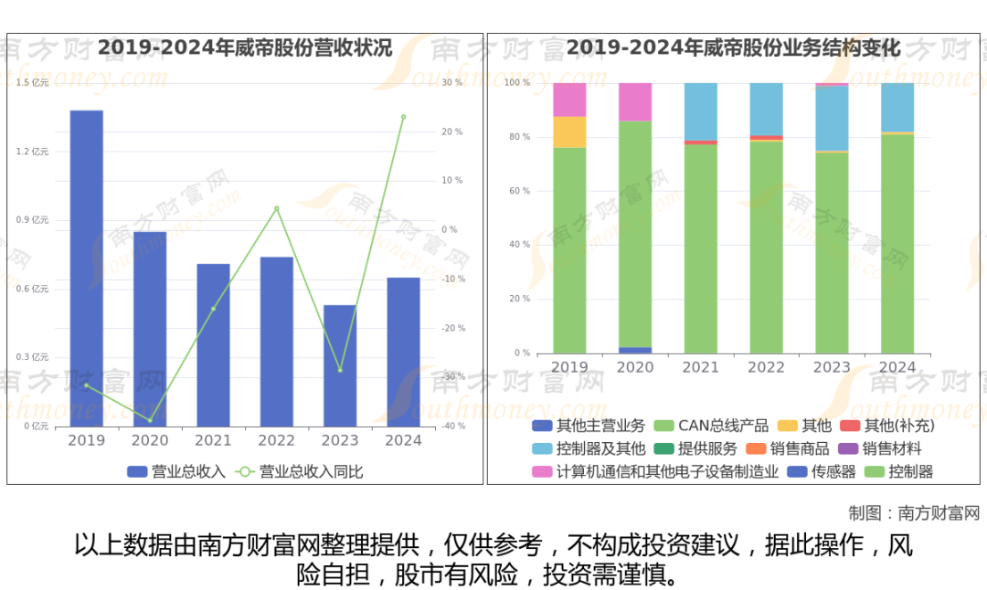 (如上图)2024年威帝股份公司营业总收入6523.57万,同比增长23.1%,近五年复合增长率为-6.28%。