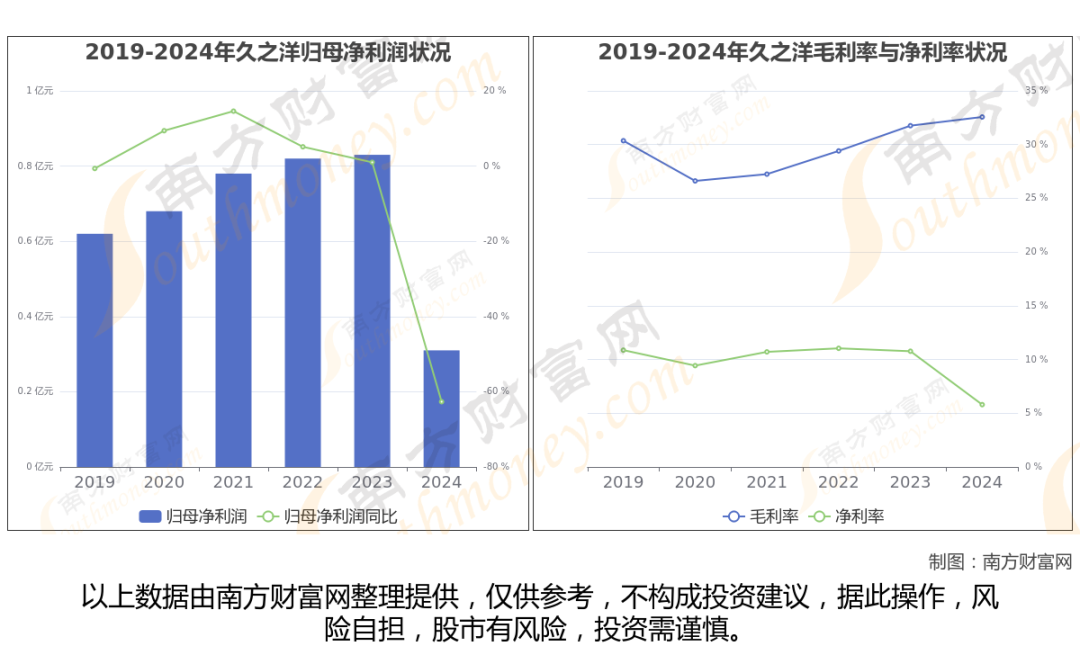 数据显示(如上图),久之洋2024年营业收入为5.34亿,同比增长-30.58%,近5年复合年增长率-7.27%。